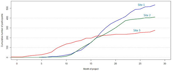 Graphical representation of the cumulative number of participants recruited in three exemplary recruitment sites to monitor the progress of the EULAT Eradicate GBC project against planned numbers.