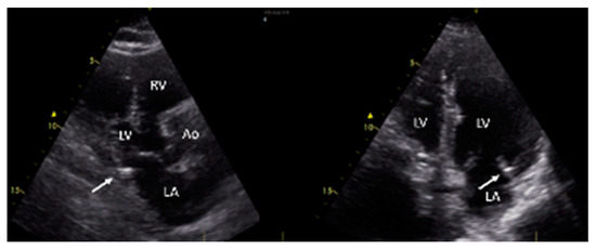 Transthoracic echocardiography in long parasternal view and modified apical four-chamber view showing mitral annular calcification in an enrolled patient. Ao—aorta; LA—left atrium; LV—left ventricle; RV—right ventricle.