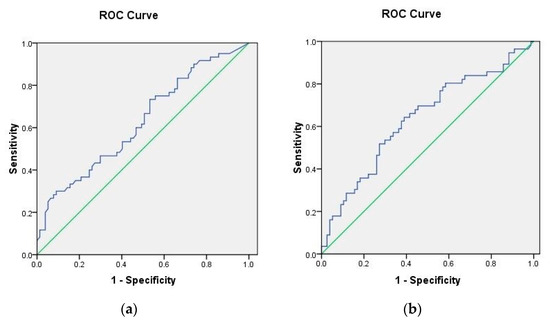 The database was compiled and processed using IBM SPSS Statistics for Windows (version 17, SPSS Inc., Chicago, IL, USA). Descriptive statistics included frequencies, central tendencies (means, medians), and variability (standard deviation, minimum and maximum values, and interquartile ranges). Specificity and sensitivity were assessed by plotting the ROC curves and calculating the areas under the curves (AUCs). Parametric and non-parametric tests (t-test, Mann–Whitney U) were used to compare means or medians between specific groups (with or without MAC). Significant associations between variables with or without normal distribution were identified using the Pearson and Spearman coefficients, respectively. Univariate models for variables such as the patients’ levels of studied markers, glycated hemoglobin, blood pressure, etc., were analyzed to see which clinical characteristics could predict the risk of MAC. The threshold for statistical significance was set at p < 0.05.