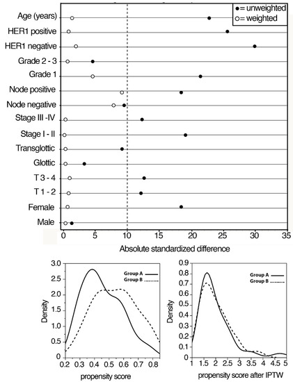 To the best of our knowledge, this is the largest retrospective study assessing the survival in two homogeneous groups of patients with locoregionally advanced glottic LSCC treated by BioRT with cetuximab compared to patients treated by upfront surgery. Considering that LSCCs from different subsites have distinct presentations and prognoses, in this study, we analyzed only cancers starting from the glottis subsite. Herein, we also used the propensity score (PS) method for weighting patients so that the resulting groups will have similar characteristics to those created through random assignment, balancing the distribution by IPTW estimators on the set of clinical covariates and HER1-expression.