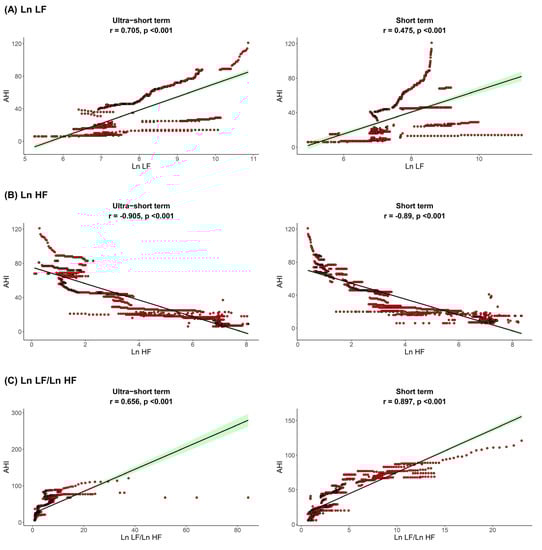 Correlation between AHI (A) Ln LF, (B) Ln HF, (C) Ln LF/Ln HF. Apnea-hypopnea index, AHI; total power, Ln TP; very low frequency, Ln VLF; low frequency, Ln LF; high frequency, Ln HF.