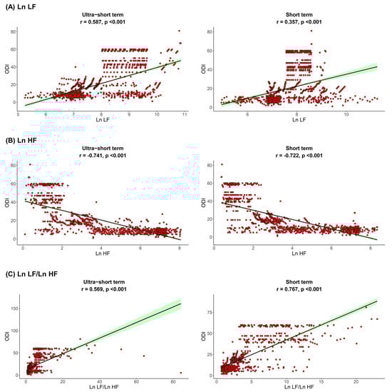 Correlation between ODI and (A) Ln LF, (B) Ln HF, (C) Ln LF/Ln HF. Oxygen desaturation index, ODI; total power, Ln TP; very low frequency, Ln VLF; low frequency, Ln LF; high frequency, Ln HF.