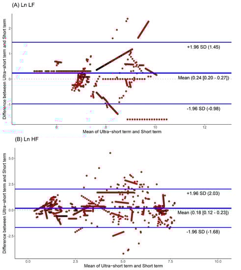Moreover, we used Bland-Altman plots to analyze the consistency of the HRV parameters. The Bland-Altman plots for HRV analyses based on ultra-short and short-term segments are shown in Figure 4. We found that the major HRV parameters, such as Ln LF, Ln HF, and Ln LF/Ln HF, were mostly located within the upper and lower 2.0 SD lines. This means that the agreement of HRV parameters between the ultra-short and short-term segments was substantial.