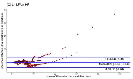 Agreement rate of heart rate variability parameters between ultra-short- and short-term methodology using Bland-Altman plots: (A) Ln LF, (B) Ln HF, (C) Ln LF/Ln HF (standard deviation, SD; low frequency, Ln LF; high frequency, Ln HF).