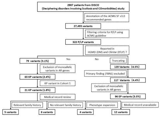 - Kalia, S.S.; Adelman, K.; Bale, S.J.; Chung, W.K.; Eng, C.; Evans, J.P.; Herman, G.E.; Hufnagel, S.B.; Klein, T.E.; Korf, B.R.; et al. Recommendations for reporting of secondary findings in clinical exome and genome sequencing, 2016 update (ACMG SF v2.0): A policy statement of the American of Medical Genetics and Genomics. Genet. Med. 2017, 19, 249–255. [Google Scholar] [CrossRef]
