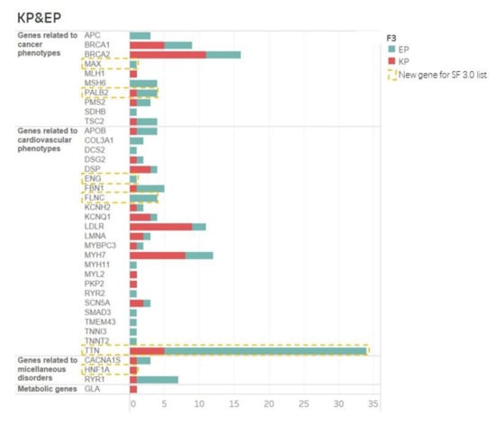 - Miller, D.T.; Lee, K.; Chung, W.K.; Gordon, A.S.; Herman, G.E.; Klein, T.E.; Stewart, D.R.; Amendola, L.M.; Adelman, K.; Bale, S.J.; et al. ACMG SF v3.0 list for reporting of secondary findings in clinical exome and genome sequencing: A policy statement of the American College of Medical Genetics and Genomics (ACMG). Genet. Med. 2021, 23, 1381–1390. [Google Scholar] [CrossRef]