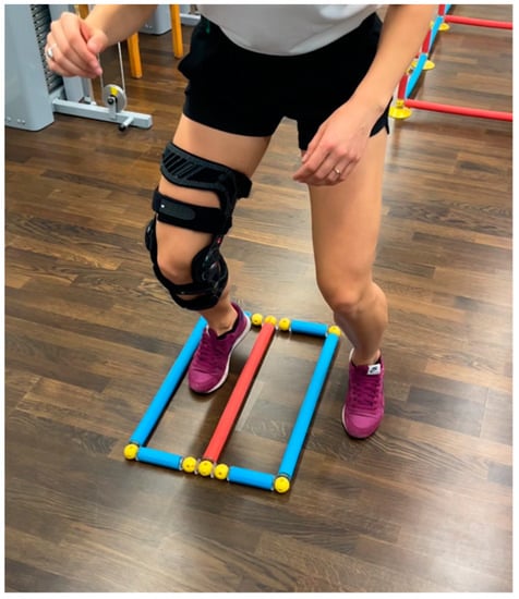The BIA consists of stability tests, two-leg and one-leg countermovement jumps (CMJ), standardized hop parkour, and a speed test [9]. The BIA showed excellent test-retest reliability for two-leg CMJ, moderate reliability for the two-leg stability test, and good reliability for all further included test items [10]. Individuals did warm up with a standardized protocol, including 10 min (min) of ergometer cycling and one test run through all tests of BIA. The BIA test battery was already described in detail [9,10]. In brief, it includes seven tests. First, individuals must balance with both legs for 30 s (s) on a balance board (TST Trendsport, Grosshöflein, Austria), measuring the center of pressure and giving instant biofeedback to participants about the position of the disc (Figure 1). A higher score will be reached when few movements and centered balance are measured. The second task is similar, but patients stand on one leg only, first on the dominant and second on the non-dominant leg. The third task is a two-leg countermovement jump (CMJ) wearing a movement sensor (Myotest S.A., Sion, Switzerland) in a belt for capturing height differences. A one-leg CMJ follows a two-leg CMJ, performed in the same manner just with a single leg. This is followed by a three-repetition plyometric jump test. The sixth task is a speed jump test. Hereby, a standardized single-leg hop parkour test (TST Trendsport, Grosshöflein, Austria) (Figure 3) with 16 forward-backward and sideway jumps must be completed with both dominant and dominant non-dominant legs.