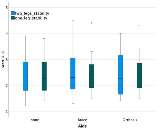 Twenty-four subjects (13 female, 11 male) with an age of 24 ± 2 years, a height of 1.75 ± 0.08 m, and a weight of 65 ± 8.5 kg were included. The median score for the two-leg stability test was 2.3 (1.72 to 2.90,) and for the one-leg stability test, 2.3 (1.90 to 2.88) (Figure 4).