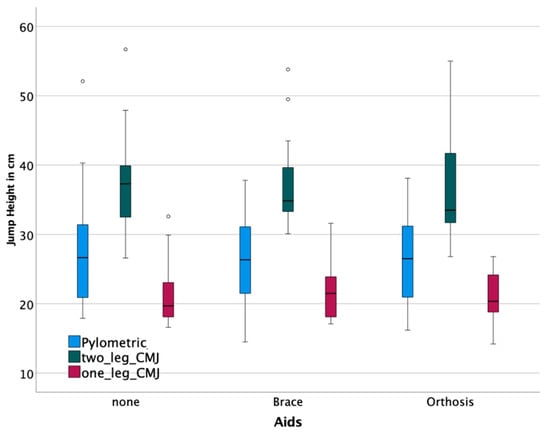 Participants performed the plyometric jump test without any knee stabilizer with a mean jump height of 27.6 ± 8.4 cm, with a brace of 25.9 ± 7.0 cm, and with an orthosis of 25.9 ± 6.4. For two-leg CMJ, the range of means between the three groups was 36.6 to 37.3 cm and 21.0 to 21.7 cm for one-leg CMJ. Median and IQRs are displayed in Figure 5.