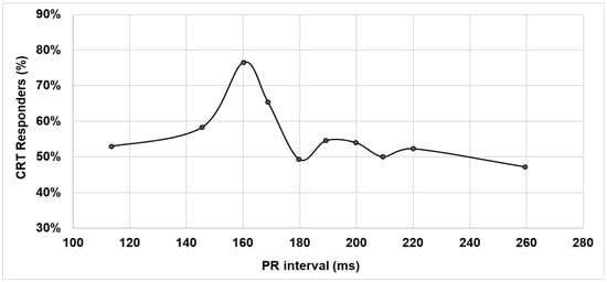 The percentage of responders to CRT was not constant as a function of the baseline PR interval. Rather, CRT response in terms of LVESV reduction showed a sharp peak—higher than 76%—for the baseline PR interval equal to 160 ms, as shown in Figure 1.