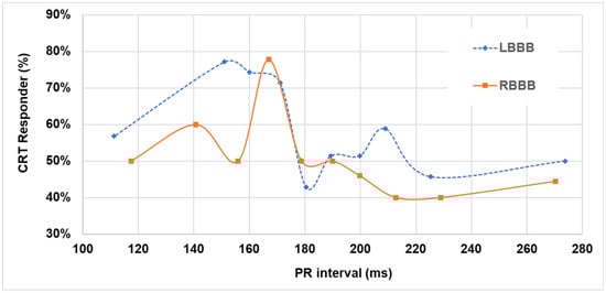 In LBBB patients the window of PR intervals, which benefit from a simultaneous biventricular pacing with sensed AV delay at 100 ms, is large, comprised between 150 and 170 ms (Figure 2) possibly due to fusion between spontaneous RV and paced LV depolarizations. Fusion would take place when the AV delay is about 50–60 ms shorter than the PR interval, in other words, programmed at a value in the range of 62–67% of the PR interval. In RBBB patients, for whom there is no spontaneous RV depolarization, fusion would be possible only between right and left paced depolarizations and only at very specific timing conditions; this would explain the sharp peak in CRT responders as shown in Figure 2. The observation that CRT response rapidly decreases for patients with short or long PR intervals, compared with the PR interval range of 150–170 ms, is consistent with the hypothesis of loss of VV and/or AV synchrony. For example, in LBBB patients with short PR intervals, say, for example, PR ≤ 120 ms—which may occur in about 6% of patients—setting an AV delay at 100 ms results in no LV pre-excitation or in other words that the LV becomes activated by the spontaneous RV depolarization through the septum, therefore, there is no modification of LBBB; while in patients with long PR intervals, for example, PR ≥ 200 ms—which may occur in up to 44% of patients—setting a AV delay at 100 ms may result in too early LV activation with negative hemodynamic consequences due to too short left AV intervals [25], which may lead to reduced diastolic filling times, reduced atrial contribution to LV stroke volume, high left atrial pressure, mitral regurgitation, and ultimately to a condition similar to pacemaker syndrome [26]. In outliers of the optimal PR interval range, AV and VV tailoring rather than shipment settings may prove beneficial, especially when dynamically tailoring occurs according to changes in the PR interval [24,27].