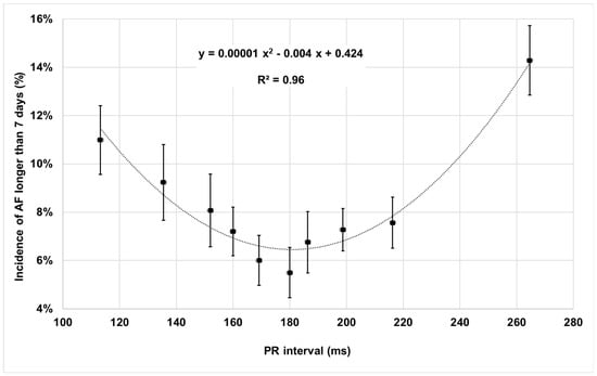 During a median follow-up of 20 months (IQR = 12–42 months), AF longer than 7 days occurred in 149/1718 (8.7%) patients. The incidence of AF longer than 7 days as a function of the baseline PR interval is described in Figure 3. AF incidence data were fitted with a second-order polynomial function which showed a minimum AF incidence at about PR = 180 ms with a very high fit correlation (R square = 0.96).
