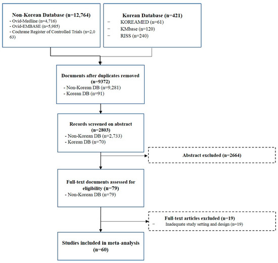 Based on the database searches, 13,185 records were identified using a systematic review (Figure 1). After removing duplicates, 2803 records were checked for titles or abstracts, and 1690 studies were excluded after a thorough examination, of which 60 studies met the inclusion criteria after full-text review (Figure 1). No relevant articles were identified from the reference lists of review articles or meta-analyses.
