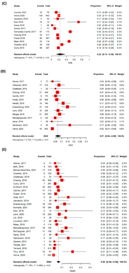 Estimated event rate of (A) the sustained virologic response, (B) any adverse events, (C) serious adverse events, (D) development of hepatocellular carcinoma, and (E) mortality in decompensated liver cirrhosis patients treated with direct-acting antiviral (DAA).