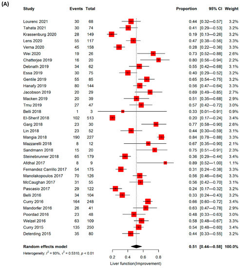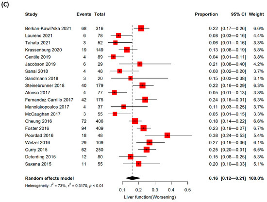 Since improvement in liver function is an important endpoint in patients with DC, a thorough analysis was performed in patients with decompensation only to observe the effect of DAA on improvement or deterioration of liver function. Most studies (n = 17) defined changes in liver function using MELD, while eleven used changes in the Child–Pugh class, four used both, and eight observed clinical signs such as portal hypertension. Evaluation of improvement in liver function was conducted based on 34 studies that showed a pooled event rate of 51% (95% CI: 0.44–0.58) (Table 3). Further analysis was performed using six studies to observe whether the efficacy of DAA led to delisting from liver transplantation (LT) following re-compensation from DC. The positive impact of DAA allowed 16% (n = 6, 95% CI: 0.05–0.4) of the studied patients to be removed from the LT lists. However, deterioration of liver function could not be avoided in 16% (95% CI: 0.12–0.21) of DC patients when the analysis was performed according to 20 studies with heterogeneity of I2 > 70% for both outcomes (Table 3, Figure 3A–C).