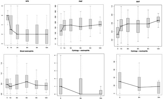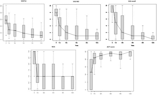 Table 2 shows the differences in the Patient-Reported Outcome Measures (PROMs) scores (SNOT-22, VAS scores for smell and NO, NCS and ACT) and the objective measurements (NPS, PNIF, SSIT and cytology findings) between follow-ups (see also Figure 1 and Figure 2).