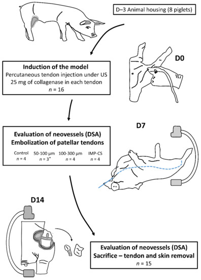 The identification of the most adequate embolization agents requires the use of animal models that allow arterial catheterization. However, there are only a few large models of tendinopathy allowing angiographic exploration for embolization. A porcine model of patellar tendinopathy with neoangiogenesis was thus developed by our team [16]. A previous study showed the feasibility and reproducibility of induced patellar tendinopathy after collagenase injection. Neovascularization was confirmed by angiographic findings and pathological analyses.