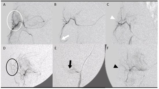 Figure 2. Embolization procedure at D7 using various embolization agents: microspheres (A–C) and imipenem/cilastatin (D–F). (A) Initial digital subtraction angiography (DSA) of a right geniculate artery showing neovascularization-related blush (white circle). (B) After embolization using 50–100 µm microspheres according to the “pruning” technique, DSA showed a “dead tree” aspect of the embolized area with a filling area by collaterals (white arrow). (C) DSA control at D14 showed no recurrence of neovascularization at the site of tendinopathy (white arrowhead). (D) The initial DSA of a right geniculate artery showing a blush related to neovascularization (black circle). (E) After embolization with an IMP/CS emulsion in an iodinated contrast medium, opacification revealed a truncated appearance of the geniculate artery (black arrow). (F) The DSA control at D14 showed repermeabilization of the native artery with no recurrence of neovessels (black arrowhead). - The fourth group (2 pigs, 4 tendons) was embolized at D7 using an emulsion of imipenem/cilastatin (IMP/CS group) (500/500 mg) diluted in 10 mL of Visipaque iodinated contrast (GE Healthcare, Marlborough, MA, USA). The mixture was injected 0.1 per 0.1 mL until complete stasis of the feeding artery according to the Martinez et al. technique [18] was achieved (Figure 2).