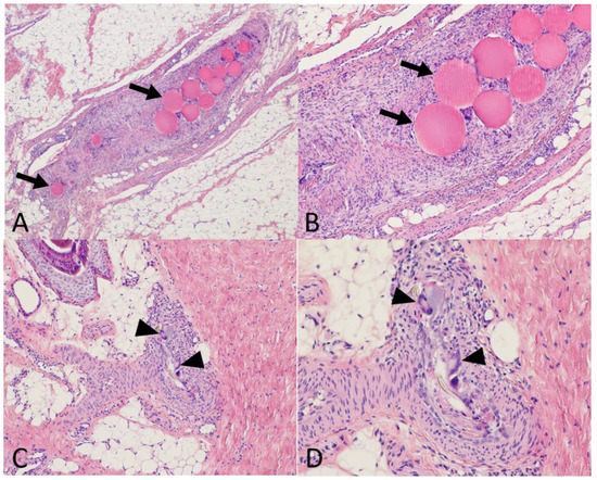 Histological evaluation of the safety of embolization. Using a standard stain (Hemathein Eosin Saffron) at ×40 (A), ×100 (B,C), and ×200 (D) magnification on tendon and skin samples taken 7 days after embolization. (A,B) Tendon treated by 50–100 µm microspheres. The peritendinous artery obliterated by the embolization material (arrows) with a granulomatous reaction. (C,D) Skin samples in the area of a transient livedo episode during embolization with Imipenem/Cilastatin (IMP/CS) emulsion. Dermohypodermal arteriole with granulomatous reaction with giant cells (black arrowheads) resorbing exogenous debris (IMP/CS crystals).