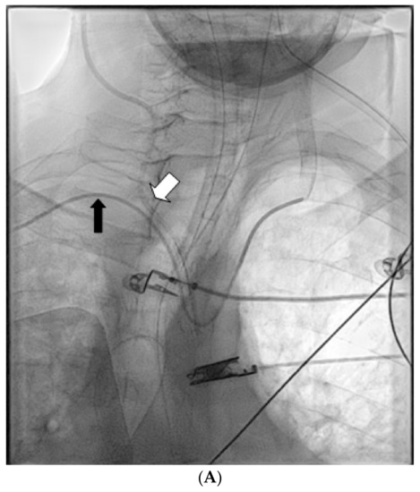 (A) Digital angiography confirming right common carotid artery (CCA) catheterization with a CVC (white arrow). An angiography catheter in the arterial system is also visible (black arrow). (B) Angiography during removal of the CVC and compression of the CCA. (C) Final result after release of compression, 5 min later with no evidence of extravasation.