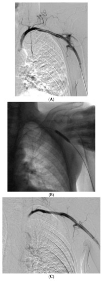 - Tokue, H.; Tsushima, Y.; Morita, H.; Endo, K. Successful interventional management for subclavian artery injury secondary to internal jugular catheterization. Cardiovasc. Intervent. Radiol. 2009, 32, 1268–1271. [Google Scholar] [CrossRef] [PubMed]