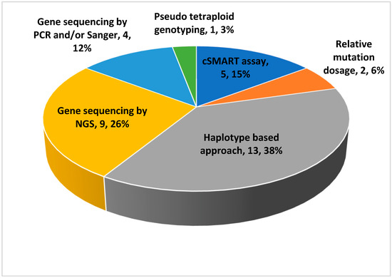 Moreover, Figure 2 shows the subdivision of the studies based on the methods of analysis used. Of them, the haplotype-based approach is the most used, as it is a method that allows the simultaneous identification of variants inherited as paternally, maternally, and de novo. In almost all studies, the pregnancies belonged to families at risk for that particular disease and the result of the non-invasive method was compared with the result of genetic testing obtained with invasive method. The discussion of the various studies was divided into sub-sections according to the nosological category.