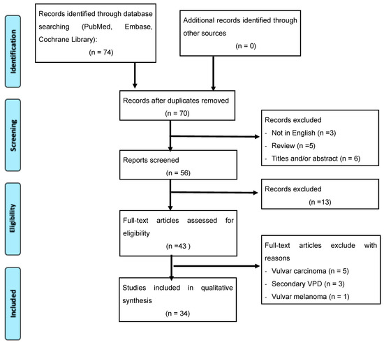 We initially selected 74 studies from different databases; of these, only 70 records were screened. Of these records, 43 studies were assessed for eligibility whereas 4 were excluded because of being related to vulvar cancer or melanoma and 3 because they dealt with secondary vulvar Paget (Figure 1). Titles and/or abstracts of studies retrieved using the search strategy and those from additional sources were screened independently by 2 review authors (L.D.C. and V.C.) to identify studies that potentially met the aims of this review. The full text of these potentially eligible articles was retrieved and independently assessed by them. Any disagreement between them over the eligibility of particular articles was resolved through discussion with a third (external) collaborator (G.B.). Two authors (L.D.C. and V.C.) independently extracted data from articles about study features and included populations, types of intervention (medical therapy or surgery), and outcomes. Any discrepancies were identified and resolved through discussion (with a third external collaborator where necessary).