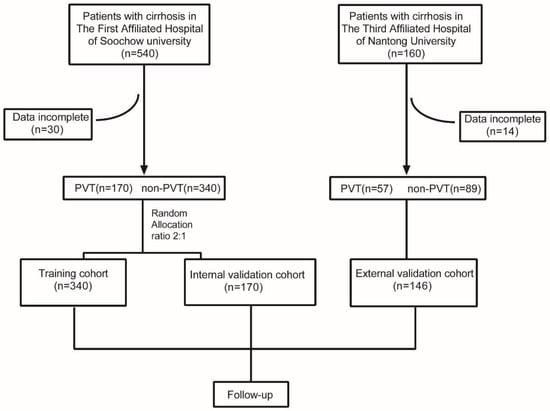 Clinical data of 700 patients with cirrhosis treated in the Department of Infectious Diseases at the First Affiliated Hospital of Soochow University and The Third Affiliated Hospital of Nantong University from January 2017 to March 2022 were collected retrospectively. Forty-four patients were excluded from the study due to the missing data, and finally, there were 656 patients enrolled in the study. We used randomized assignment to divide the 510 patients from The First Affiliated Hospital of Soochow University into two groups: the training and internal validation cohorts (ratio 2:1). The training cohort contained 340 patients, and the internal validation cohort contained 170 patients. A total of 146 patients from The Third Affiliated Hospital of Nantong University were selected as the external validation cohort. The flow diagram is shown in Figure 1.