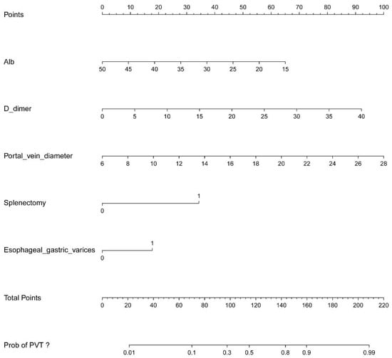 PVD is considered the best indicator for portal hypertension. The wider the portal vein is, the more likely it is to cause damage to the venous vessel wall due to the extended high pressure in the lumen, and when combined with slow blood flow, the blood easily forms a vortex, promoting coagulation and eventually promoting the formation of PVT [,]. Dong et al. found that PVD was the strongest independent risk factor for predicting PVT development (OR: 3.96, AUC: 0.88; p < 0.01), with a cutoff of >12.5 mm []. Increased PVD is associated with an increased risk of PVT development. From examining patients from two medical centers, Yuan et al. found that PVD and splenic diameter could predict PVT after splenectomy []. This is consistent with the results of the present study. PVT is also a complication of intra-abdominal surgery, especially splenectomy. Postsurgical PVT is currently limited to a few small descriptive case series, and a recent study conducted by the Mayo Clinic reported an occurrence rate of PVT after splenectomy was for approximately 8.1% after reviewing datasets from 1745 patients []. The mechanism of surgery-associated PVT may be thrombosis provoked by intraoperative vascular manipulation or local postoperative inflammation []. In the study of Zhang et al., splenectomy was an independent risk factor for PVT in patients with cirrhosis and acute decompensation []. In a retrospective analysis of 113 liver cirrhosis patients without malignancy, splenectomy was identified associated with a 10-fold increased risk of PVT, which was independent to the severity of liver dysfunction []. In addition, in our study, we also found that esophageal and gastric varices was independent risk factor for PVT. A prospective trial to identify the impact of PVT in patients with cirrhosis showed that the development of PVT was independently associated with baseline esophageal varices (p = 0.01) [], which is in accordance with our research. Esophageal and gastric varices is considered to be another sign of portal hypertension. A slowed blood velocity could result from increased pressure in the portal vein induced by varicosity. PVT would be more feasible when combined with damage to the endothelium of blood vessels.