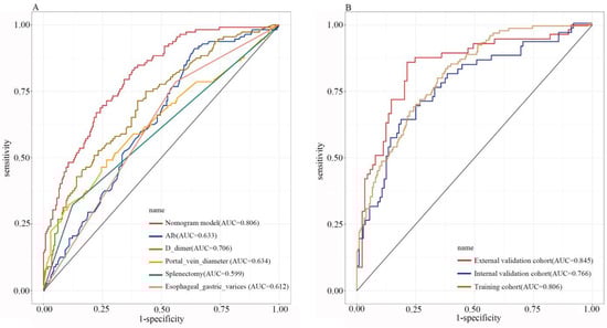- Yuan, H.L.; Wang, M.; Chu, W.W.; Li, F.X.; Lu, J.J.; Li, Y. Nomogram Model for Prediction of Portal Vein Thrombosis in Patients with Liver Cirrhosis After Splenectomy: A Retrospective Analysis of 2 Independent Cohorts. Med. Sci. Monit. 2021, 27, e929844. [Google Scholar] [CrossRef]