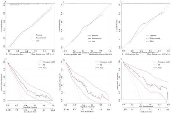 Calibration curves in the training cohort (A), internal validation cohort (B), and external validation cohort (C). The X-axis represents the predicted probability, and the Y-axis represents the actual probability of PVT. The black solid line indicates the bias correction with bootstrapping (1000 repetitions), and the dotted line represents the training, internal validation, and external validation cohort. The perfect prediction corresponds to the 45° dashed line. The decision curve analysis and 95% CI in training cohort (D), internal validation cohort (E), and external validation cohort (F). The horizontal black line represents the treatment of no patients, the slash gray solid line represents the treatment of all patients, and the red solid line represents the net benefit of the prediction model.
