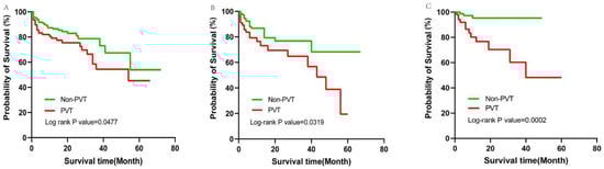 Kaplan–Meier curves in training cohort (A), internal validation cohort (B), and external validation cohort (C). The red line represents the PVT group, and the green line represents the non-PVT group. The X-axis indicates the survival time, and the Y-axis indicates the probability of survival.