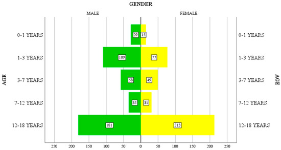 Although the gender distribution of patients is similar (412 boys and 385 girls), the correlation between patients’ gender and age group (as showed in Figure 1) indicates a slightly higher incidence of female intoxication for the 12–18-year-old group (213 girls compared to 181 boys), consisting of 54% of patients in this age group.