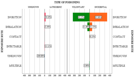 Analyzing the type of intoxication versus the route of exposure, it is found that ingestion is the most common route, with a similar distribution on all categories of intoxication—87.5% of voluntary intoxications, 87% of accidental intoxications, and 83.33% of iatrogenic cases. Exposure by inhalation was identified in lower percentages, both for voluntary and accidental intoxications (11.38% and 12.75%, respectively).