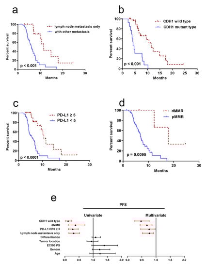 Clinicopathological and molecular factors to predict PFS. (a) Kaplan–Meier curve of lymph node metastasis (p < 0.001); (b) Kaplan–Meier curve of CDH1 (p < 0.001); (c) Kaplan–Meier curve of PD-L1 (p < 0.001); (d) Kaplan–Meier curve of MMR (p = 0.0095); (e) forest plot of univariate or multivariable Cox proportional hazard regression indicating the impact of different characteristics on PFS.