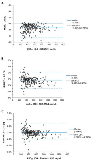 Bland–Altman plots for AUC24 of vancomycin according to the estimated glomerular filtration rate equations. (A) Between C-G and MDRD. (B) Between C-G and CKD-EPI. (C) Between C-G and the revised LM. Outliers were excluded ((A), n = 2; (B), n = 2; and (C), n = 3). See Appendix A (Figure A1) for all data results, including outliers. Abbreviations: AUC, area under the curve over 24 h; C-G, Cockcroft-Gault; CKD-EPI, Chronic Kidney Disease Epidemiology Collaboration; MDRD, Modification of Diet in Renal Disease; LoA, limit of agreement; and LM, Lund–Malmö.