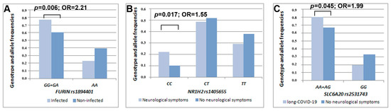 Distribution of the genotype/allele frequencies of FURIN rs1894401 depending on COVID-19 infection susceptibility (A), NR1H2 rs1405655 depending on the presence/absence of accompanying neurological symptoms (B), and SLC6A20 rs2531743 depending on the presence/absence of neurological consequences over a prolonged period (C) in the examined sample of mild-to-moderate COVID-19 cases.