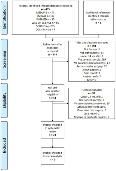 | Ovid Medline | (exp “orthognathic surgery”/OR exp “orthognathic surgical procedures”/OR genioplasty) AND (accuracy OR precision OR stability) AND (((“patient specific” OR patient-specific OR customized) AND (implant OR instrument)) OR PSI OR splintless OR waferless) |