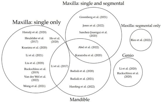 Sixteen records evaluated the accuracy of PSI for the maxilla [13,31,32,33,34,36,37,38,39,40,41,42,43,44,45,46], out of which eight exclusively focused on non-segmental Le Fort I procedures [31,32,34,36,38,43,45,46] and two on non-segmental Le Fort I procedures in conjunction with the accuracy of PSI for mandibular osteotomies [13,39]. Six studies included mixed single and segmental Le Fort I osteotomies [33,37,40,41,42]. One of the included studies investigated exclusively segmental Le Fort I osteotomies [44]. Three records reported the accuracy of PSI for mandibular osteotomies exclusively [29,30,47]. Two studies investigated the accuracy of PSI for genioplasty. Table 2 contains the accuracy measurements and Figure 2 contains a Venn diagram of the study distribution.