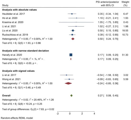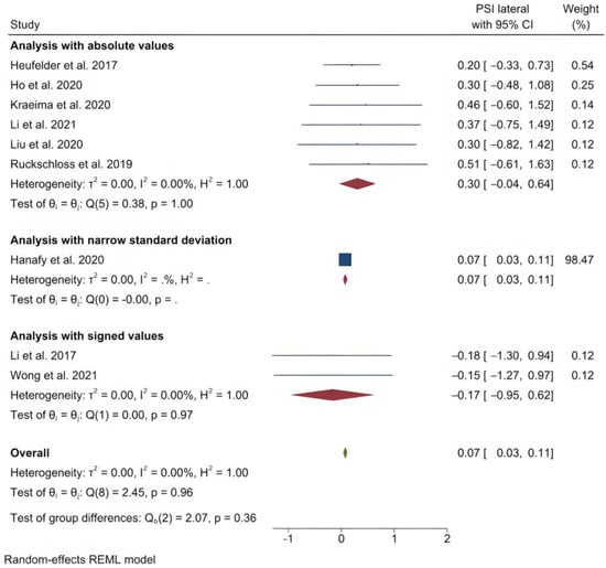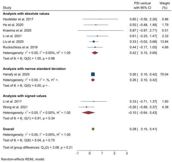 The studies were divided into categories based on the PSI location: at the Le Fort I level, mandible or genioplasty. The only subset that had sufficient data for a meta-analysis comprised those studies employing single Le Fort I osteotomies exclusively. The studies reporting absolute values were analyzed [32,34,36,39,43,45]. A stratification of the meta-analysis on absolute and signed values was done to allow correct interpretation of the estimates on two studies [13,46]. Furthermore, to allow a similar presentation of all values in one estimate, one stratum was used for a study that provided a very narrow standard deviation that was an outlier among other studies [31].