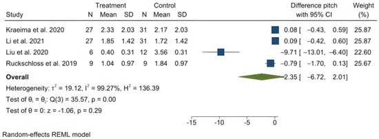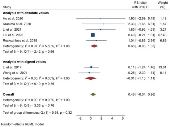 Forest plot showing differences in pitch deviation between PSI and control (conventional osteosynthesis and CAD/CAM splint or wafer).