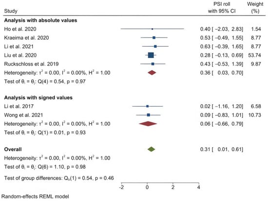 Forest plot showing differences in roll deviation between PSI and control (conventional osteosynthesis and CAD/CAM splint or wafer).