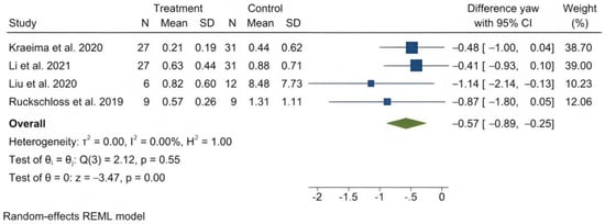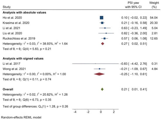 Forest plot showing differences in yaw deviation between PSI and control (conventional osteosynthesis and CAD/CAM splint or wafer).