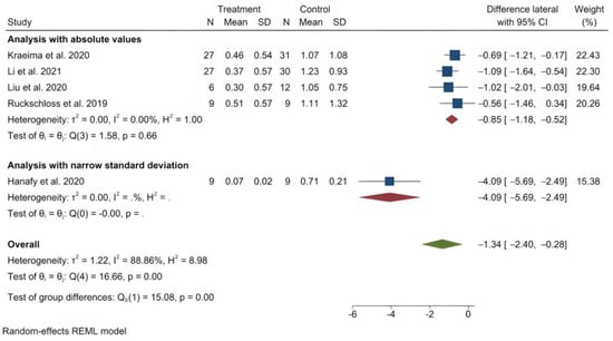 A meta-analysis was also possible on four records containing comparison data between procedures with PSI and a control group undergoing a CAD/CAM splint or wafer-based procedure [31,34,35,36,45]. This was also presented in a stratified manner, as it included the study by Hanafy et al., with a very narrow standard deviation [31]. The average translational difference between the PSI and the control was −0.85 mm laterally, −0.68 mm antero-posteriorly and −0.39 mm vertically; the average rotational difference was −2.35° for pitch, −0.47° for roll and −0.56° for yaw. The negative differences indicate that Le Fort I osteotomies with PSI deviate less from the planned bone position than procedures using CAD/CAM splints or wafers. All differences were statistically significant (p < 0.0001).
