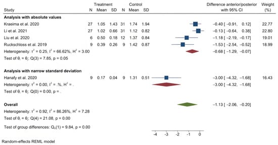 Forest plot showing differences in antero-posterior deviation between PSI and control (conventional osteosynthesis and CAD/CAM splint or wafer).