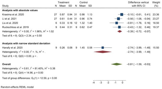 Forest plot showing differences in vertical deviation between PSI and control (conventional osteosynthesis and CAD/CAM splint or wafer).