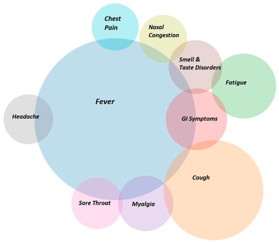 Among hospitalized patients, fever, cough, and dyspnea are the most common symptoms at presentation, as reported in the literature [27,44,46], with frequency variations across different countries. At the same time, fatigue was more prevalent among patients aged between 40 and 70 [27]. In addition to fatigue, other common symptoms in hospitalized patients included diarrhea, nausea-vomiting, headache, and myalgia [44].