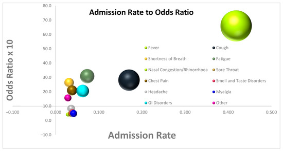 Bubble plot diagram of Admission Rate vs. Odds ratio for Admission for each of the symptoms.