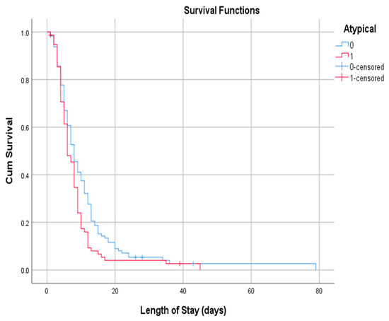 = 51.24, = 53 years, s = 14, 66% male and 34% female), we investigated whether the length of stay depended on the rarity of symptoms. Those who did not have at least one of the atypical symptoms were hospitalized for more days (p = 0.041). The Log Rank test (Mantel-Cox) demonstrated a statistically significant difference (p = 0.028) in the mean length of stay between the two groups (11,330 days in the group of patients with only typical symptoms vs. 8321 days in the group with at least one atypical symptom) (Figure 3).