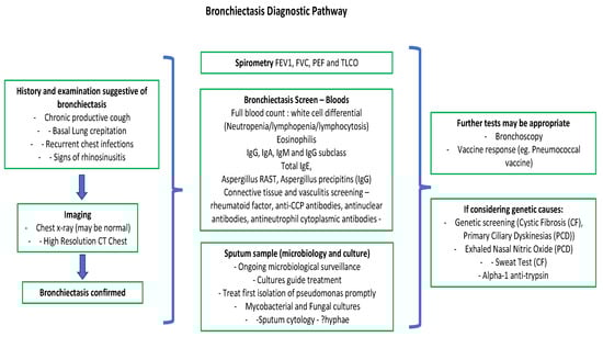 It is increasing in prevalence both in the UK, Europe and across the globe [,,]. Bronchiectasis has historically been underdiagnosed and long delays from the onset of symptoms to diagnosis of bronchiectasis have consistently been highlighted []. A typical diagnostic pathway can be seen in Figure 1.